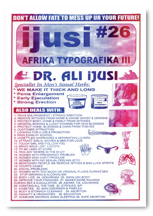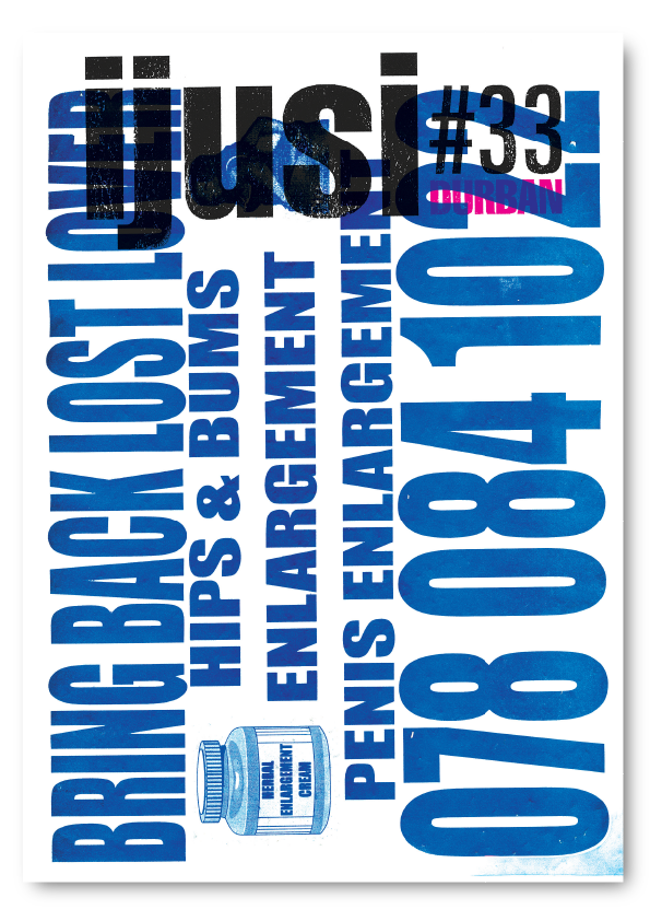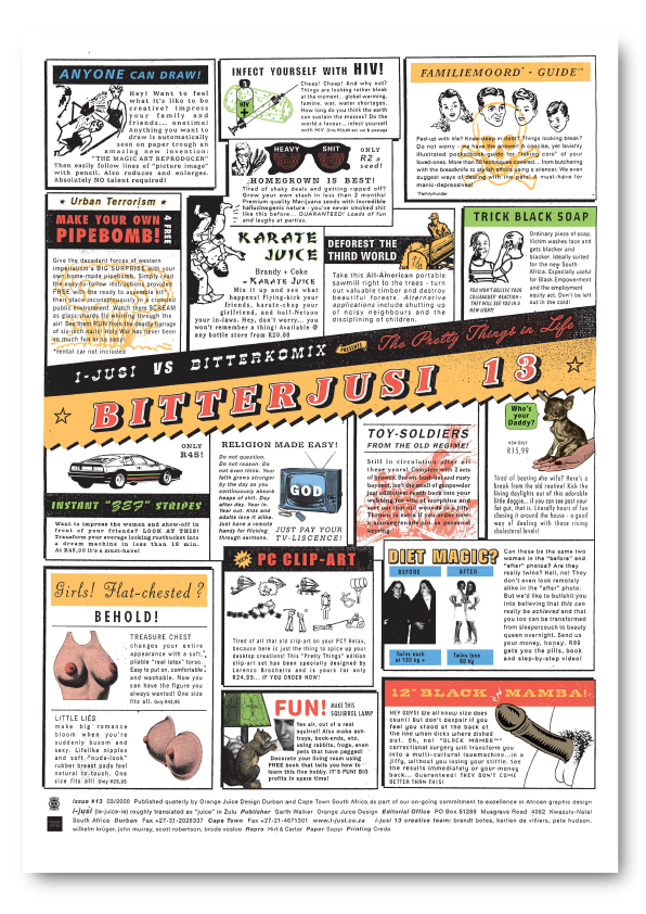 Published in 1995, this is the very first issue of Ijusi, which was also thought at the time to be the one and only issue. Celebrating South Africa’s recent Democracy and the explosion of vernacular street art that followed the restrictive Apartheid era, Ijusi #1 would prove to become a major cultural purveyor. Being the first issue, the motivation to invite designers, writers, and artists to contribute to the magazine was not yet in place, hence Garth Walker and Siobhan Gunning being the only contributors to this issue. .