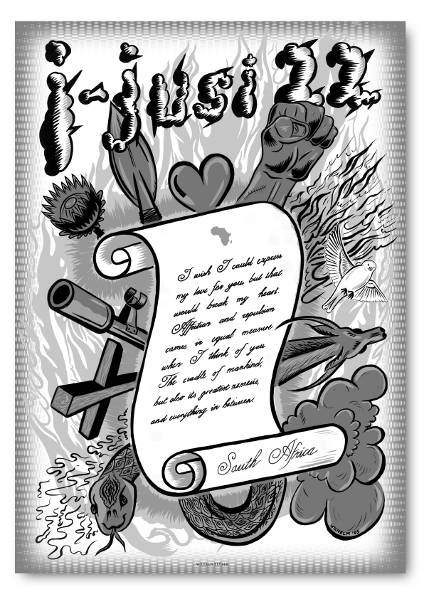 Contributors include: Berserker - Mariska Botha - Clinton Campbell - Bradley Cuzen - Wilmarie Deetlefs - Rikus Ferreira - Melissa Furter - Paul Garbett - Rhiannon Darcy Hanger - Nix Harwood - Letitia van Heerden - Roger Jardine - Anton Kannemeyer - Matt Kay - Warwick Kay - Dale Kilian - Stathi Kougianos - Wilhelm Krüger - Shane de Lange - Kim Longhurst - Mike Louw - Thabiso Mbambo - Ningihlenge Ntuli - Brad Purchase - Scott Robertson - Udo Schleimann - Marie Serfontein - Anna Sinnige - Skullboy - Alex Sudheim - Sasha Subramoney - Sumeeth Suthurgam - Fred Swart Andre Thijssen - Partick Thomas - Simon Villet - Nicolene van der Vorst - Brode Vosloo - Brenton Chelin - Eli Coelho - Steve Kotze - Blake Pickering - Niren Tolsi - Anelia Varela - Ernest van der Merwe.